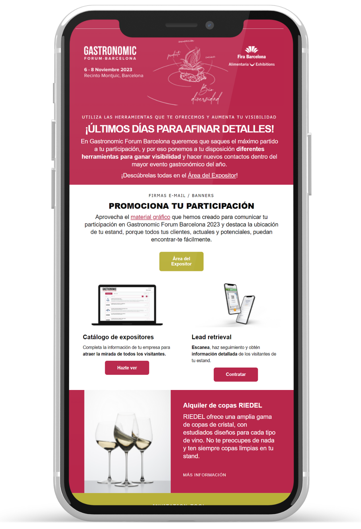 Con presencia exclusiva en el cuerpo del mensaje con link a tu web en los últimos envíos masivos antes de la celebración del evento